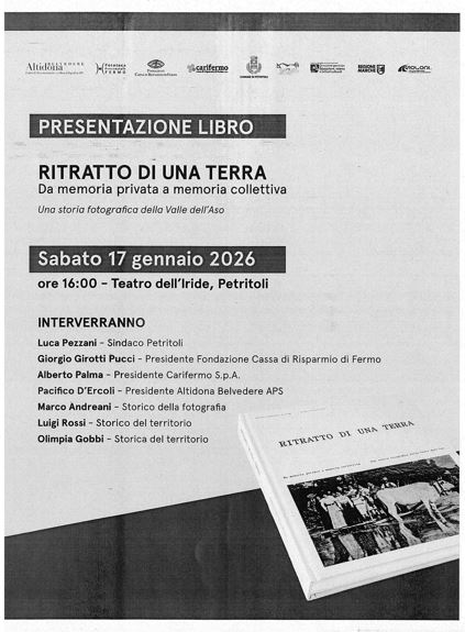 Sabato 17 gennaio 2026 presso il Teatro dell’Iride di Petritoli alle ore 16:00 si terrà la presentazione del libro strenna di Natale 2025 “Ritratto di una terra. Da memoria privata a memoria collettiva – Una storia fotografica della Valle dell’Aso”.